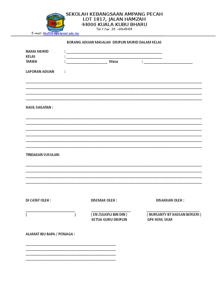 Borang Laporan Disiplin Murid : L = p=.jum=data saringan terkini:. Membina borang perekodan suhu murid, guru, pelawat menggunakan google form semasa tempoh pkp. Laporan program pembangunan sahsiah murid tahun2017. Borang aduan salahlaku disiplin pelajar maklumat laporan ( perlu dipenuhkan oleh pelapor atau pengadu) nama pelajar no kpt no pendaftaran jabatan unit disiplin sektor hal ehwal murid bahagian pengurusan sekolah harian kementerian pendidikan malaysia aras 3 & 4, blok e2, parcel e, 62604. Memastikan murid warganegara malaysia menerima buku teks spbt pada minggu pertama sesi baru tindakan awal guru spbt ükenalpasti murid yang mempunyai rekod disiplin spbt üpastikan gantian üedarkan buku teks spbt kepada murid yang layak. Borang laporan program mentor mentee.