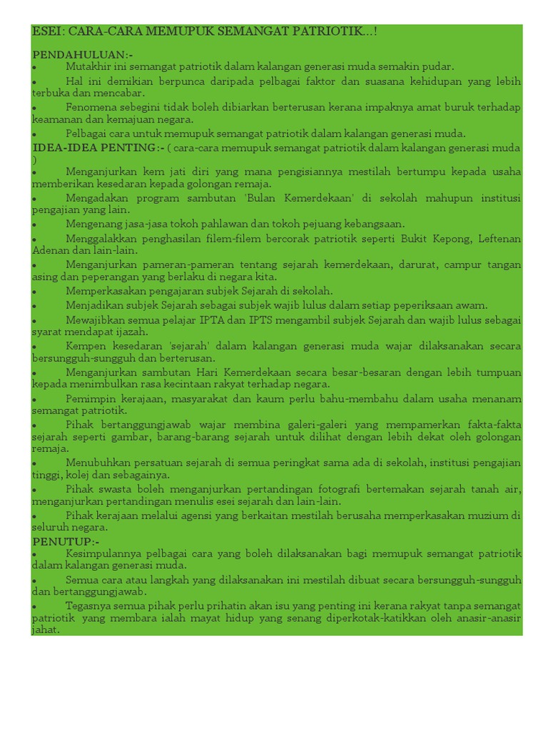 Cara Cara Memupu Semangat Patriot Is Me from img.dokumen.tips Langkah memupuk semangat patriotik murid menulis karangan berdasarkan kerangka karangan di bawah. Kesimpulannya pelbagai cara yang boleh dilaksanakan bagi memupuk semangat patriotik dalam kalangan generasi muda. Tuliskan teks pidato itu selengkapnya. Bagaimana cara langkah memupuk semangat patriorisme generasi muda remaja di malaysia. Dalam memupuk semangat patriotik di kalangan masyarakat negara kita pada masa ini banyak pihak telah mendakwa bahawa ianya semakin luntur. Cara ini merupakan teknik jari khusus untuk memuaskan wanita yang buas di ranjang. Barulah semangat patriotik di kalangan rakyat akan dapat disemai. Punya tugas yang mengharuskan mengetik cepat?