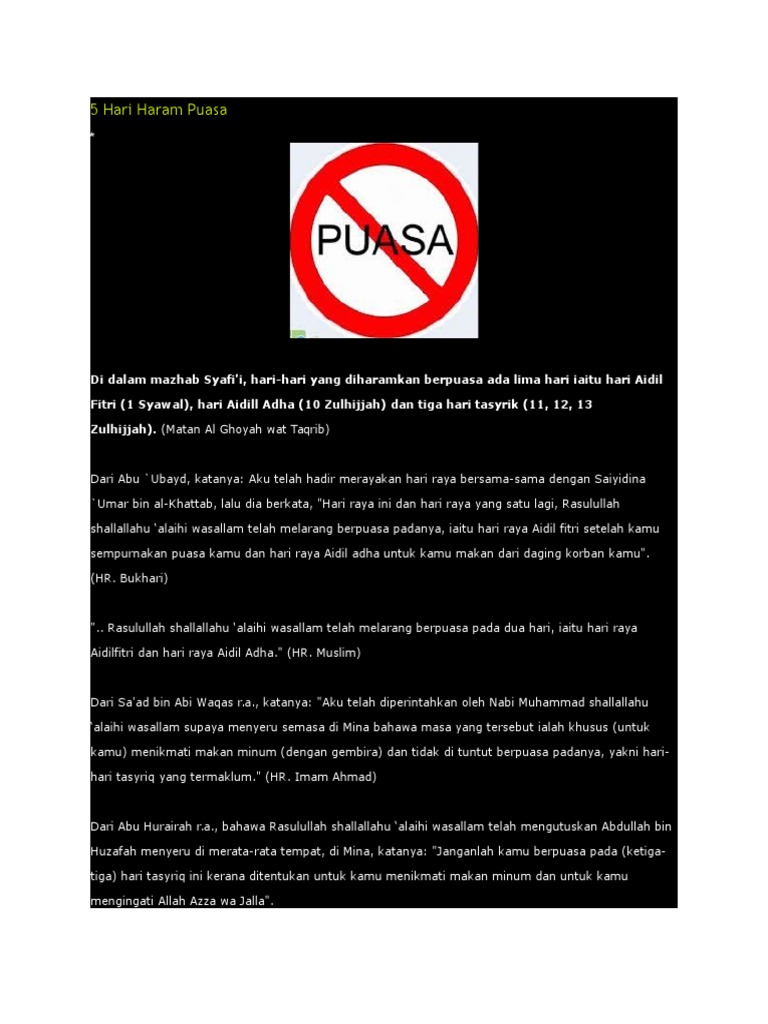 Wanita yang sedang atau nifas diharamkan mengerjakan puasa. Hari yang diharamkan berpuasa menurut islam salah satunya hari raya idul adha sesuai dengan hadits rosulullah saw, janganlah kamu berpuasa pada hari ini karena ia merupakan hari makan minum dan berzikir kepada allah. (hr ahmad). Berpuasa sunnah pada paruh kedua bulan sya'ban: Waktu haram puasa adalah waktu di mana umat islam dilarang berpuasa. Hari raya idul fitri (1 syawal).